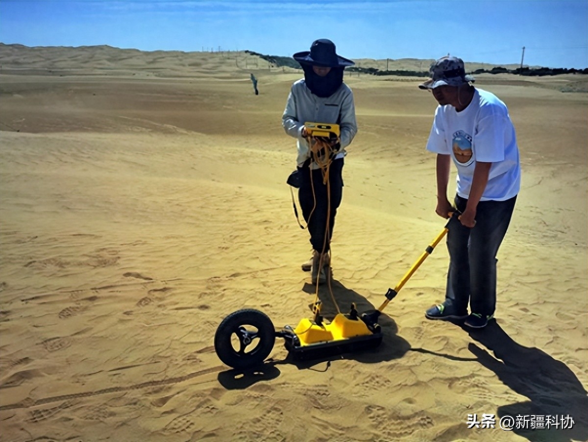 ▲科考队员利用探地雷达简捷快速地对沙丘内部构造和层理特征进行探测,研究沙丘发育机制,为防沙治沙措施提供理论依据。
