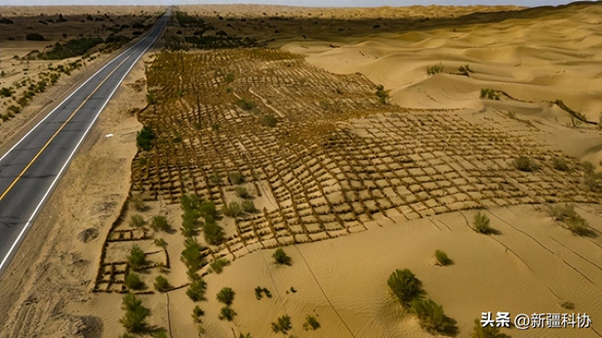 ▲塔克拉玛干沙漠公路沿线布设的草方格,远处可见公路两侧的防护林。