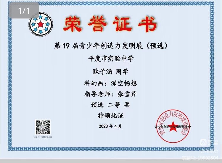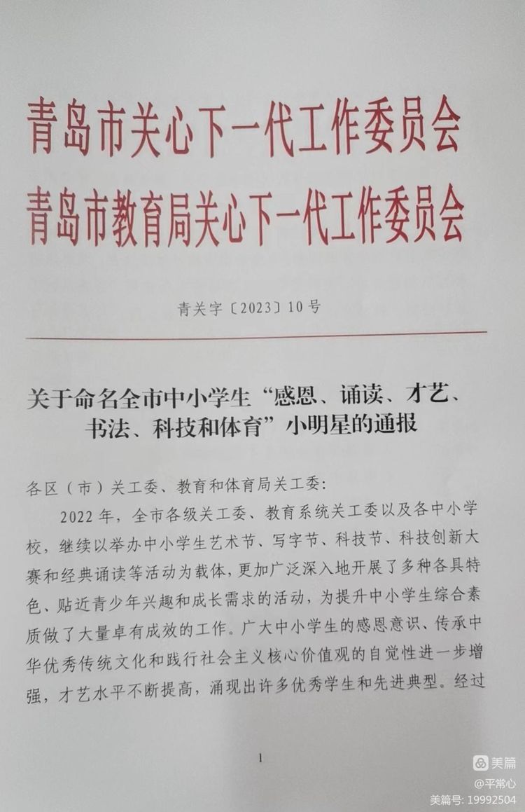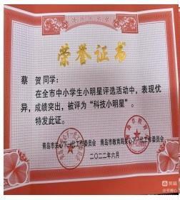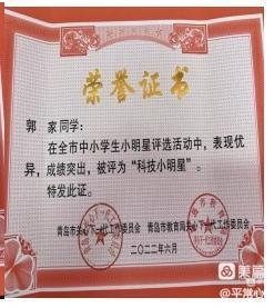 翱科创星空 强国有我—平度市实验中学两名同学荣获2023年青岛市科技小明星称号