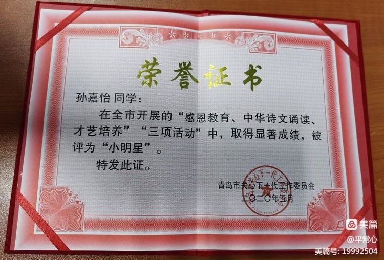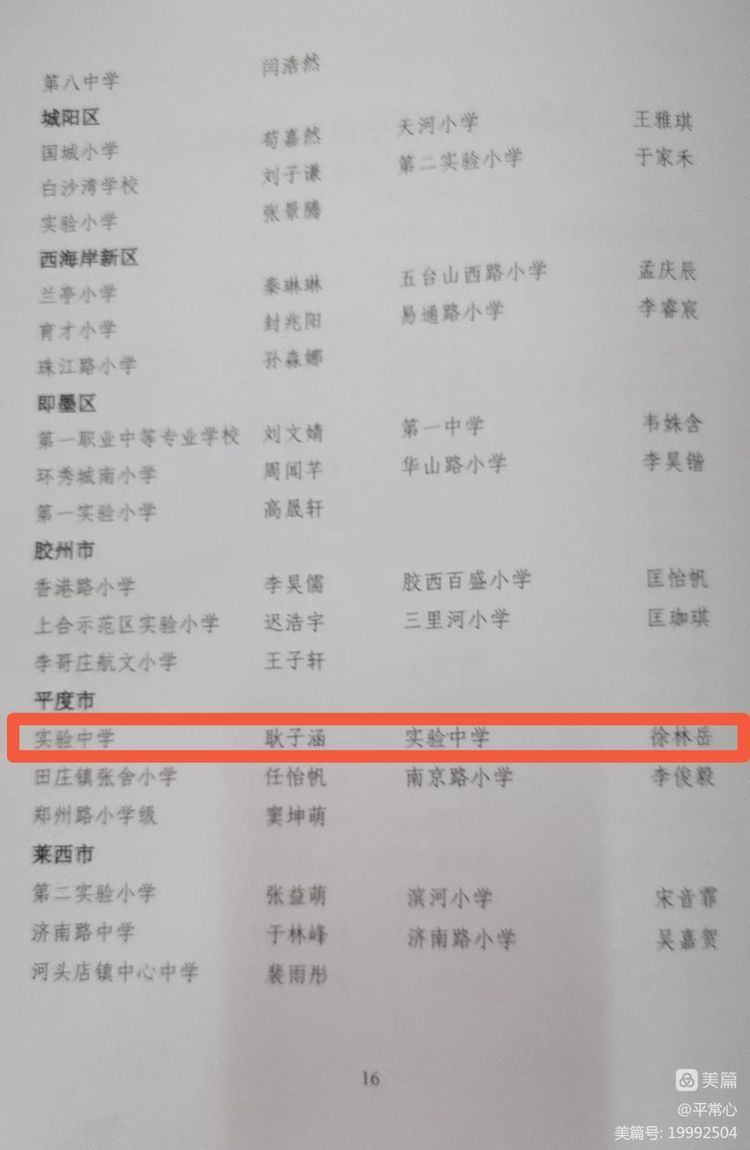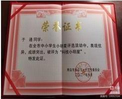 于通(2020级20班),2021年青岛市科技小明星,信息学奥赛全国一等奖及山东省一等奖、青岛市研究性学习成果一等奖、青岛市科技节比赛一等奖、青岛市小研究员等。