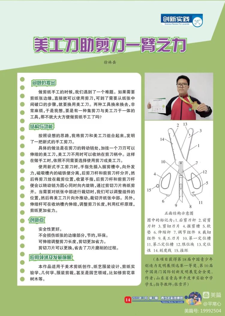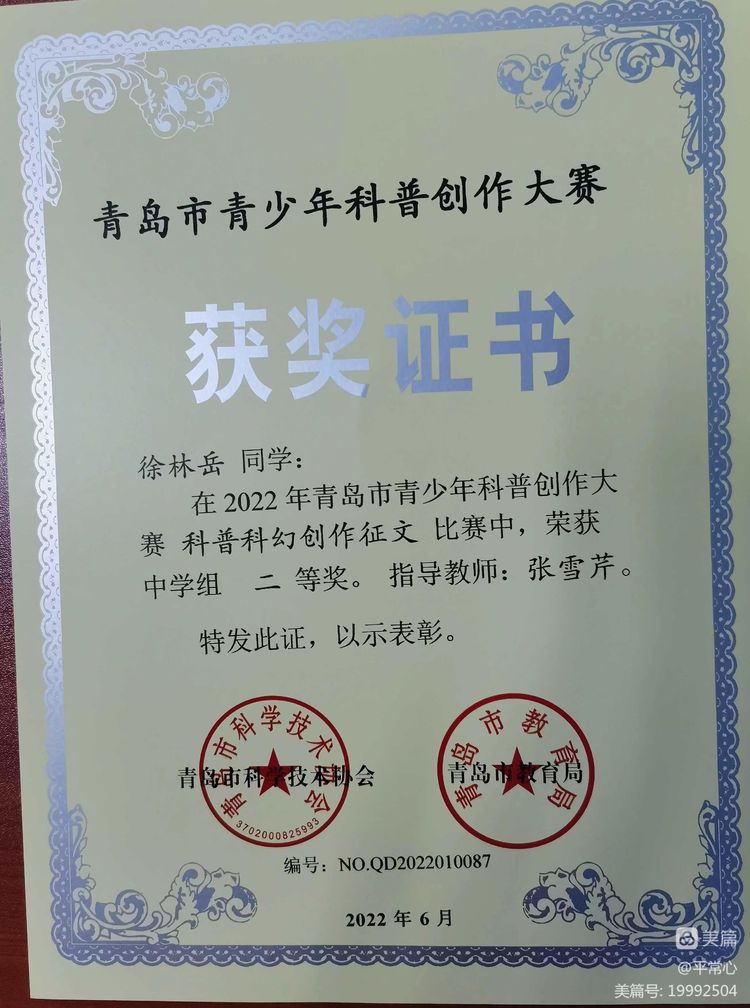 徐林岳(2020级28班),2023年青岛市科技小明星,获取国家实用新型专利、国际金奖等,科技创意论文在国家级刊物《青少年科技博览》发表。