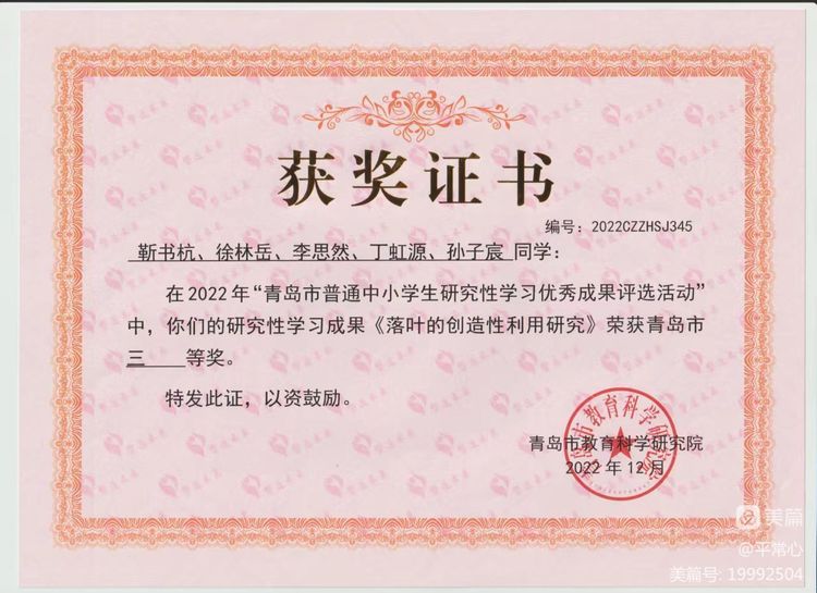 郭家(2020级21班),2022年青岛市科技小明星,第二届“中望杯”全国青少年人工智能线上竞技赛优胜奖、青岛市头脑奥赛一等奖、青岛市研究性学习成果一等奖、青岛市小研究员等。