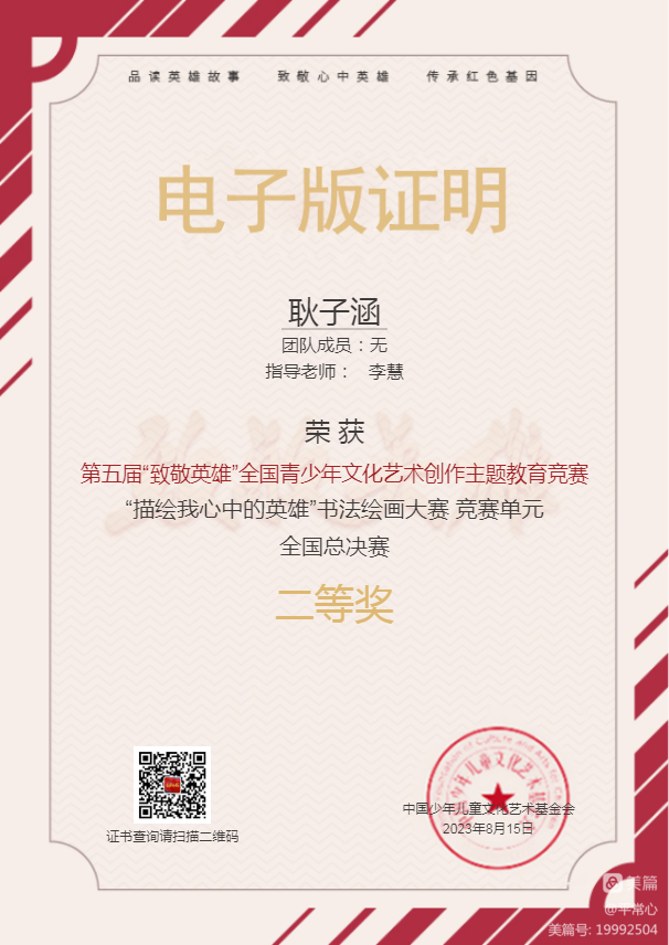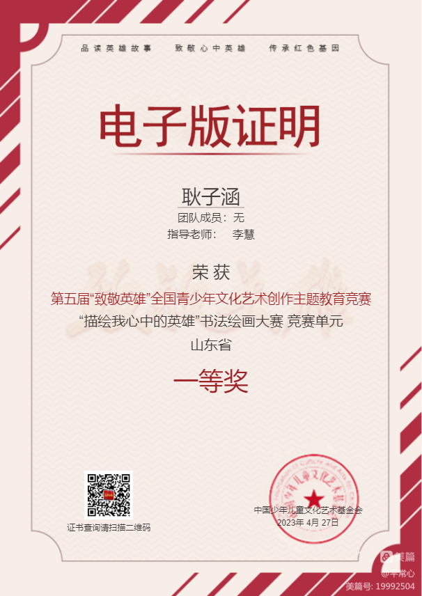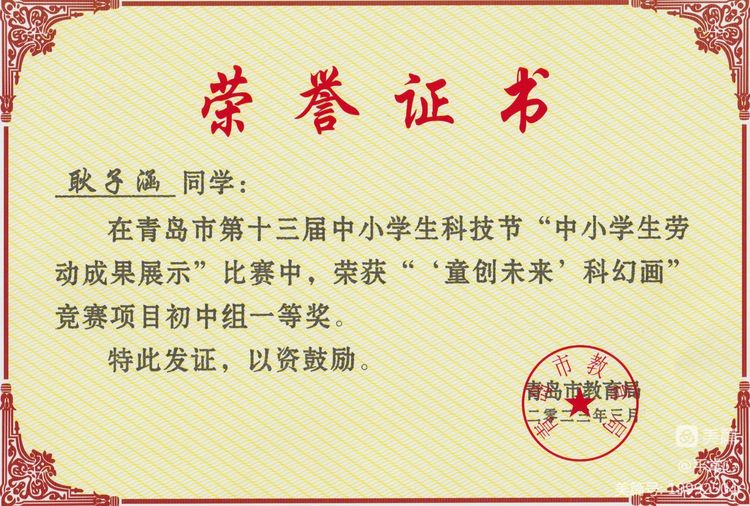 耿子涵(2022级26班),2023年青岛市科技小明星,获取第五届“致敬英雄”全国青少年文化艺术创作主题教育竞赛全国总决赛二等奖及山东省一等奖、青岛市科技节比赛一等奖、青岛市研究性学习成果三等奖等。