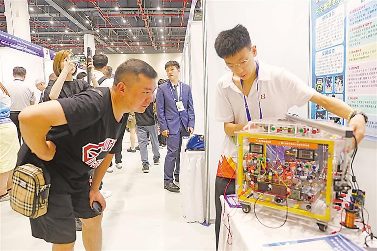 近日,在湖北武汉举行的第37届全国青少年科技创新大赛上,宁夏青铜峡市职教中心学生李航(右)展示他的作品“中学物理电学多功能数显实验仪”,并摘得本届大赛一等奖。本届大赛由中国科协、国家自然科学基金委员会、共青团中央、全国妇联和湖北省人民政府共同主办 。