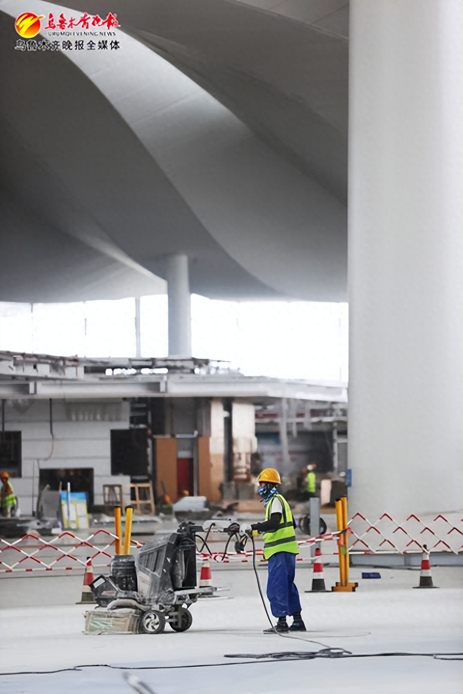 8月28日,乌鲁木齐机场改扩建工程航站楼标段,工作人员正在进行地面打磨抛光。