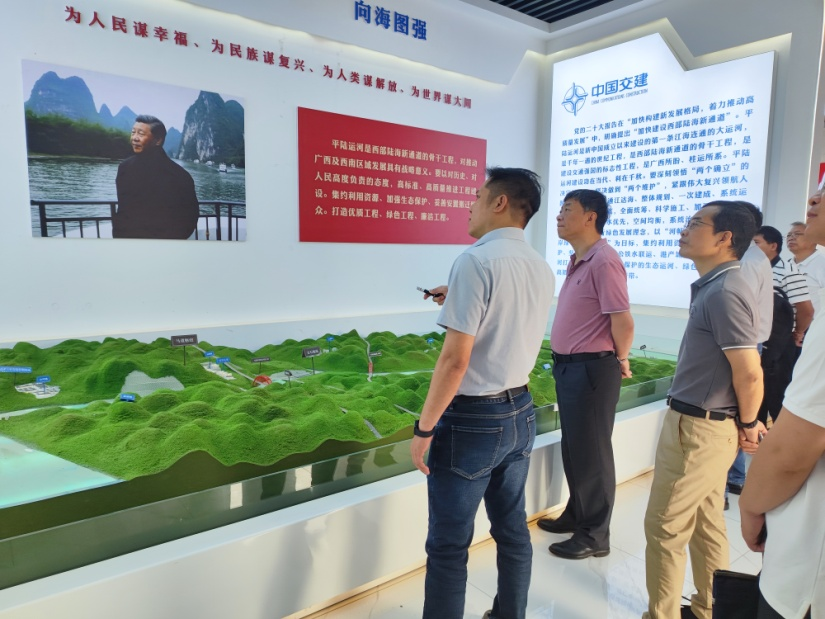 2023年5月5日,在平陆运河集团公司副总工黄建勇带领下,金峰教授与参建单位领导一行前往平陆运河指挥部展厅参观,由建设公司董事、平陆运河指挥部副指挥长潘剑作讲解说明。讲解结束后,大家前往参观马道枢纽建设工程现场,并在项目部会议室召开堆石混凝土技术交流会,会议上就枢纽工程堆石混凝土技术应用部位进行探讨。