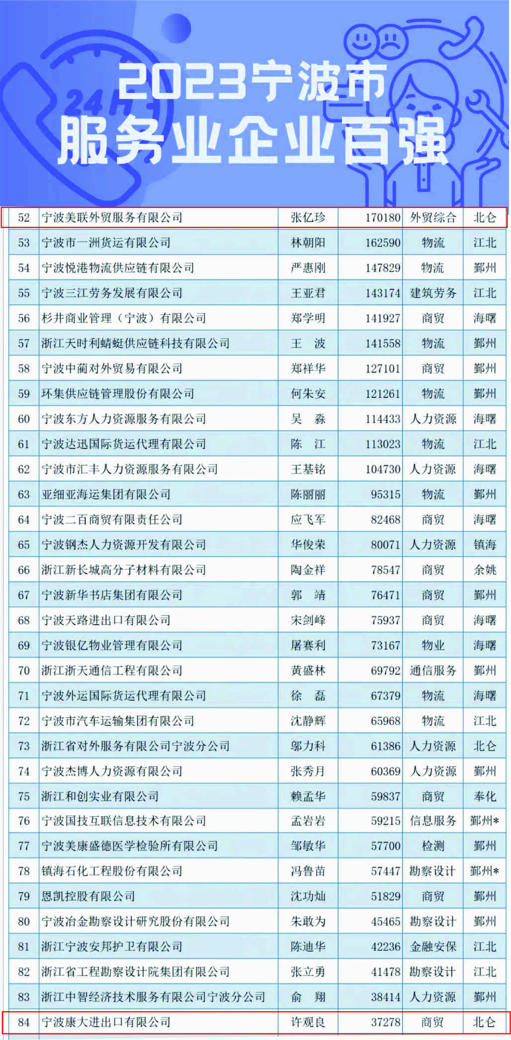协会理事长康大集团单位旗下宁波康大进出口有限公司、副理事长单位美博集团旗下宁波美联外贸服务有限公司荣获“2023宁波市服务业企业百强”!