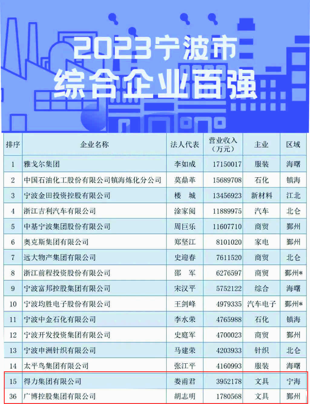 得力、广博、康大、美博荣登2023宁波企业百强榜