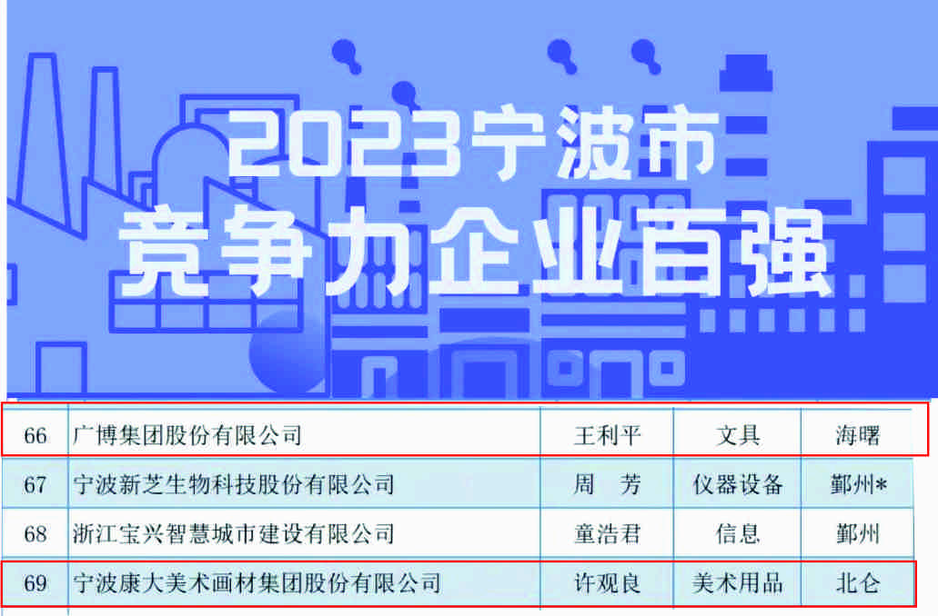 协会理事长单位宁波康大美术画材集团股份有限公司、副理事长单位广博集团股份有限公司荣获“2023宁波竞争力企业百强”!