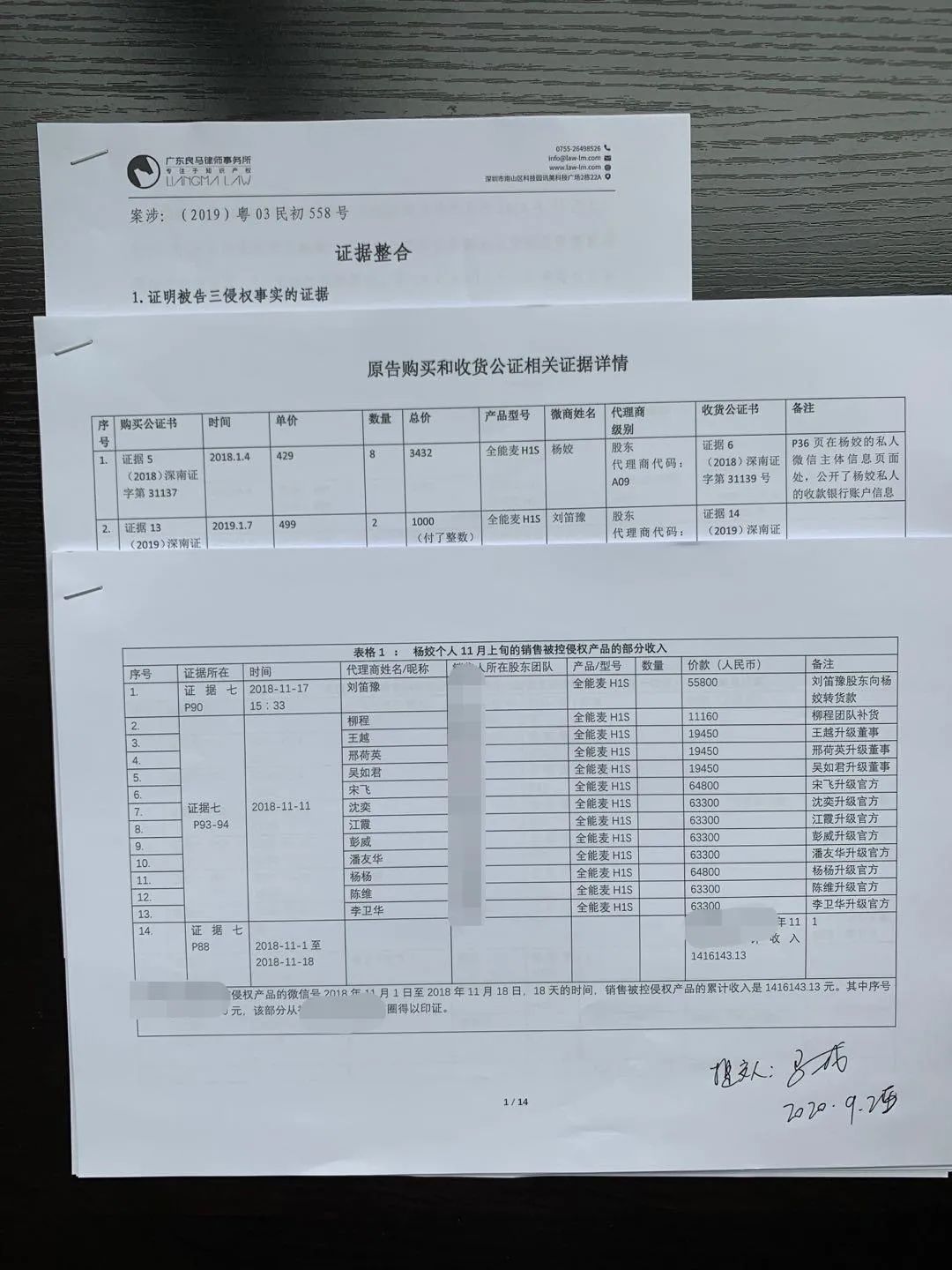 由于这一侵权行为是通过微商销售渠道进行,所以取证过程与一般的侵权案件存在巨大的区别,取证过程也异常艰辛和复杂。良马律所在经过研究后提出了详细的取证计划,得益于T公司的协同配合,对被告微商团队中21个团队成员进行21次公证购买,对主要侵权方的朋友圈进行证据保全,对与主要侵权方的聊天记录进行证据保全,对被告微商管理公众号进行了证据保全,对被告产品验证体系进行了证据保全,对被告微商管理宣传公众号进行了证据保全,对比被告唱吧宣传内容进行了证据保全。实现了全方位的搜证,最终形成了多达1864页的证据。这些扎实的证据有效的证明了被告销售被控侵权产品的数量多达390562台的事实。结合原告方主张的42.4%的利润率以及专利的贡献率,法院判决认定五被告因为实施原告的实用新型专利而获利460万元。