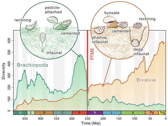 近5亿年来腕足类与双壳类的多样性变化。大灭绝前腕足类的多样性远高于双壳类,大灭绝后则相反。(陈中强教授团队供图)