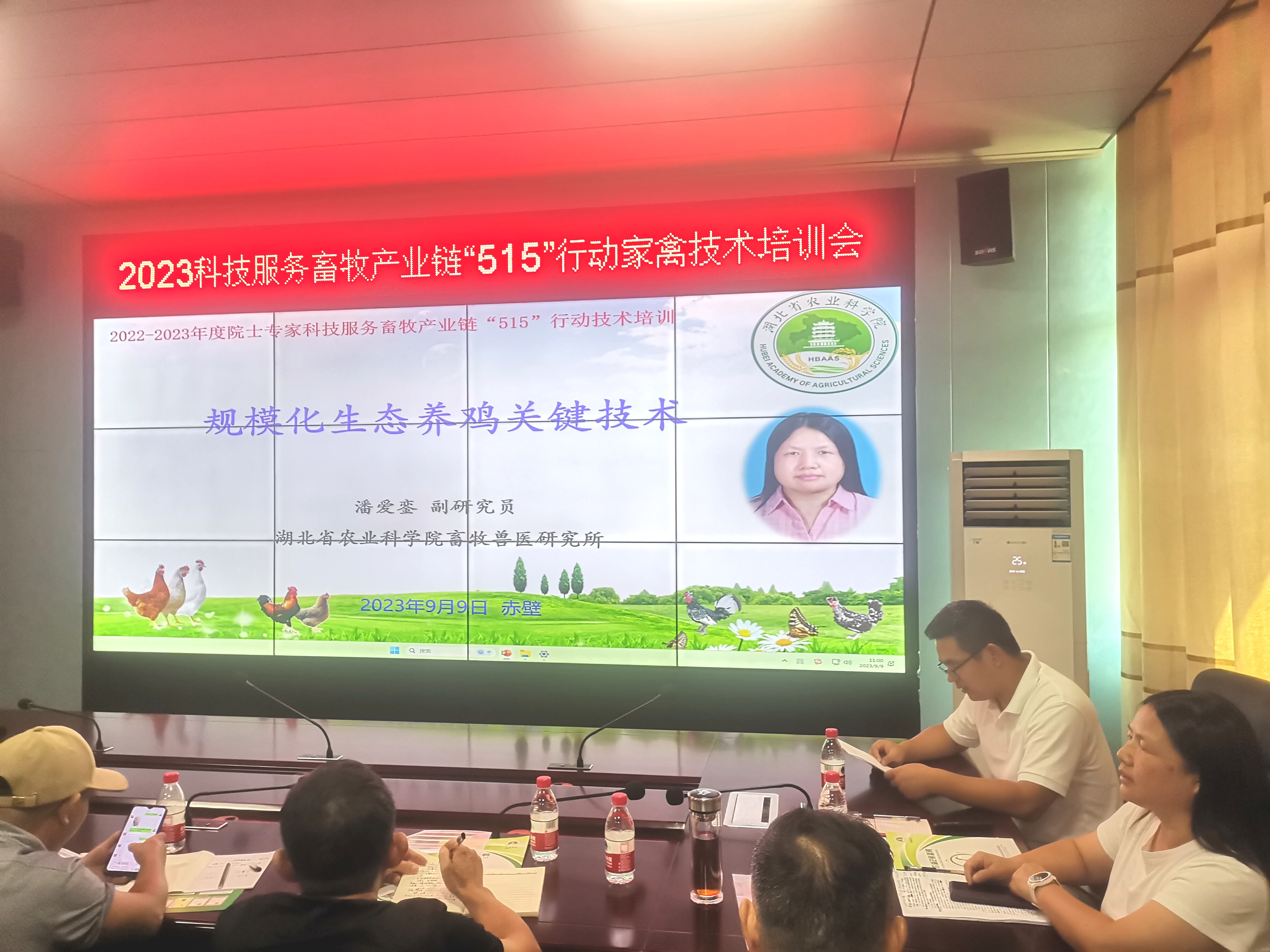 9月9日,我院联合市农业农村局在赤壁市畜牧技术服务中心举办2023年咸宁市科技服务畜牧产业链“515”行动(协同推广)家禽健康养殖技术培训会。省农科院畜牧兽医研究所梁振华副研究员、潘爱銮副研究员两位专家应邀授课。赤壁市各乡镇畜牧服务中心、养殖大户、驻场业务技术骨干近60人参加此次专题培训。