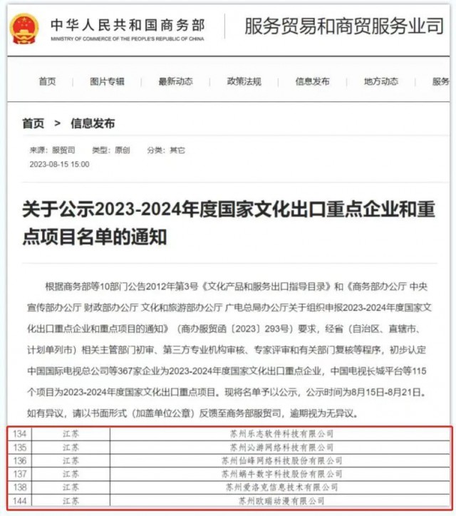 近日,“2023-2024年度国家文化出口重点企业”名单公示结束,苏州共有6家企业入选,其中沁游网络首次上榜,仙峰网络、蜗牛数字、爱洛克信息、乐志软件、欧瑞动漫均为再次入围。截至目前,全市累计共有20家企业入选国家文化出口重点企业。