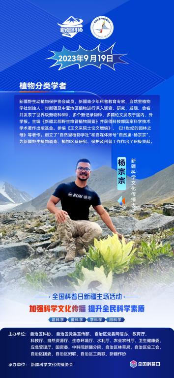 想看最攒劲的植物科普,就在2023年9月19日全国科普日新疆主场活动现场!新疆科学文化传播大使、网络科普达人杨宗宗将与观众分享他在新疆植物保护和科普方面的收获和成果,敬请期待!