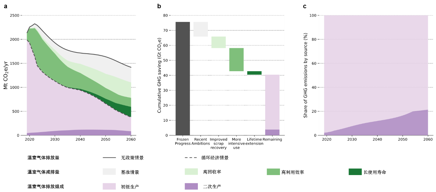 同时,循环经济策略应“均衡施策”,不同策略的碳减排潜力差异较大。循环利用的减碳潜力是有限的,提高废弃物的循环利用率可使2019-2060年累计碳排放量减少10%。相比循环利用而言,材料高效利用的碳减排潜力较大,可降低21%的碳排放。尽管延长材料使用寿命的碳减排潜力较小,仅为3%,但它是2050年之后重要的碳减排策略。