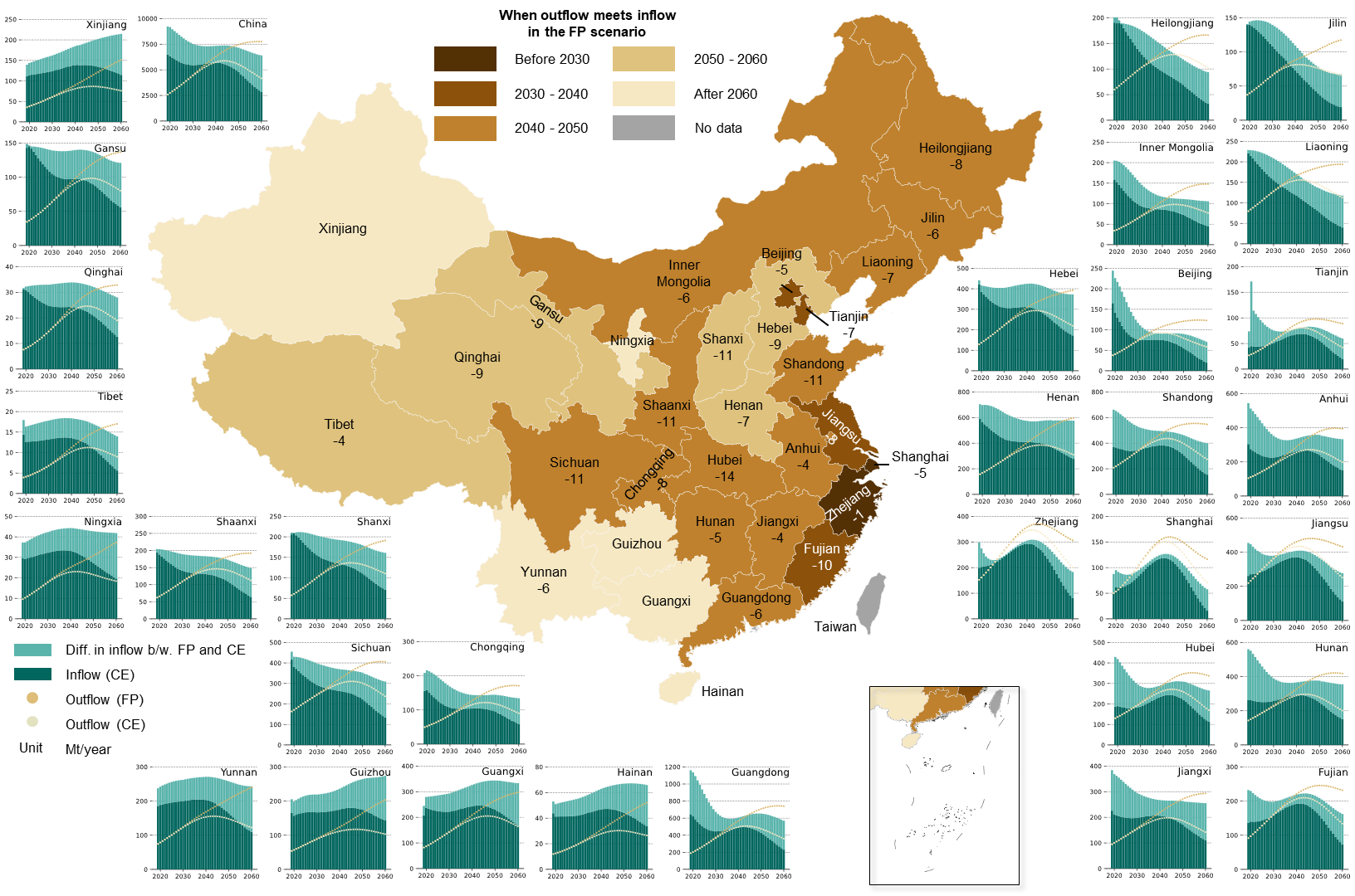 研究团队发现,循环经济策略应“因地制宜”,不同地区的碳减排潜力差异较大。在国家层面,2060年废弃物的循环利用可满足75%的原材料需求;在区域层面,循环经济政策的推行时间存在显著差异。东部沿海省份平均比西部省份提前9年进入循环经济全面转型时代。