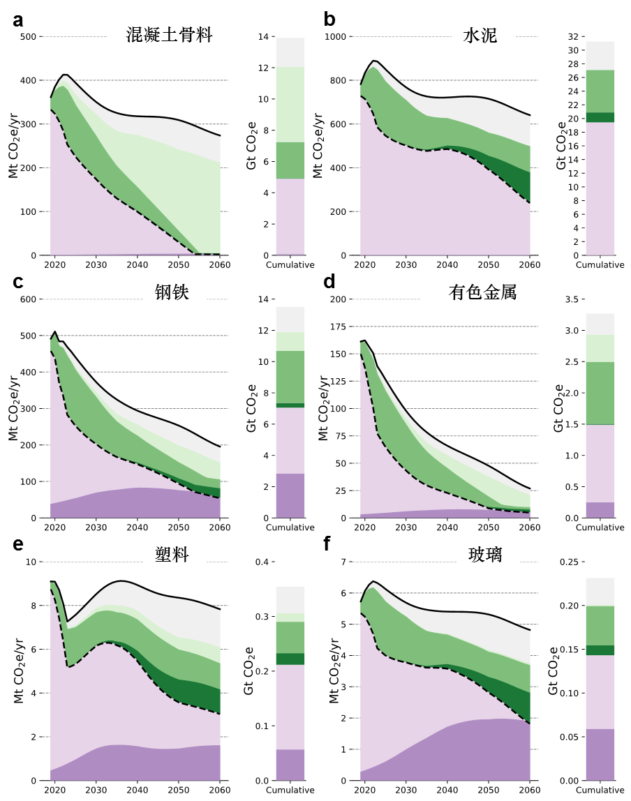 在此背景下,国际联合研究团队开发了物质-能源-碳排放集成模型,即IMAGINE Materials,以探索大宗材料“闭路循环”的可行路径及其对2060年净零排放目标的潜在贡献。研究团队首次量化了13种大宗材料(水泥、钢铁、铝、铜、橡胶、塑料、玻璃、石灰、沥青、沙子、砾石、砖和木材)在103种产品中的生产、使用、报废和再生的全生命周期代谢过程,并针对不同材料评估了3种循环经济策略的碳减排潜力。