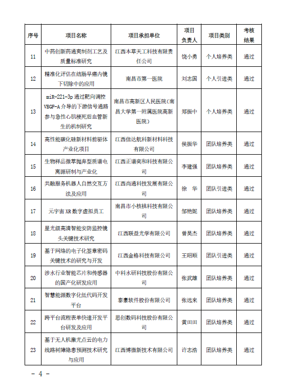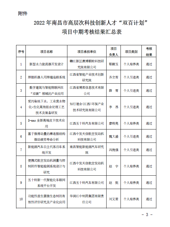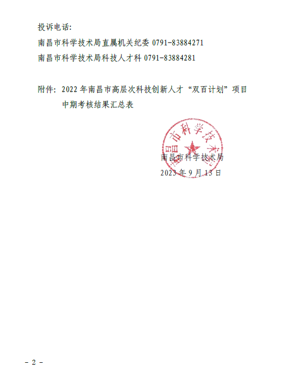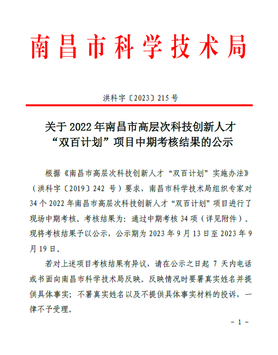 关于2022年南昌市高层次科技创新人才“双百计划”项目中期考核结果的公示