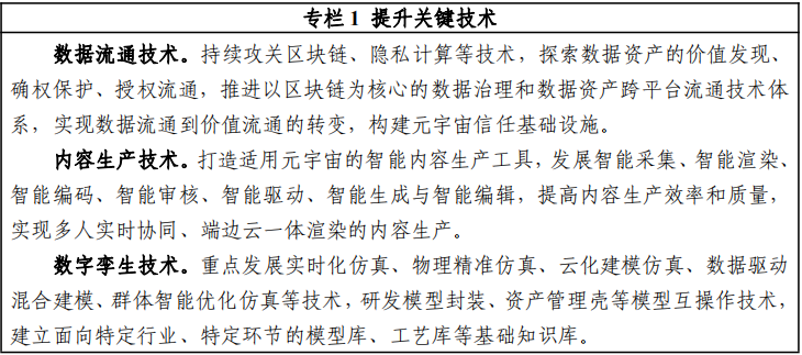 1.加强关键技术集成创新。 强化人工智能、 区块链、云计算、虚拟现实等新一代信息技术在元宇宙中的集成突破, 推动智能生成算法、分布式身份认证、数据资产流通等元宇 宙关键技术在国家重大科技项目中的布局。发展关键基础软 件,开发面向元宇宙的操作系统和中间件,突破建模软件、 绘制引擎、物理仿真引擎、沉浸式视音频编解码引擎,构建 一站式元宇宙开发平台。突破高端电子元器件,加快图形计 算芯片、高端传感器、声学元器件、光学显示器件等基础硬件的研发创新。