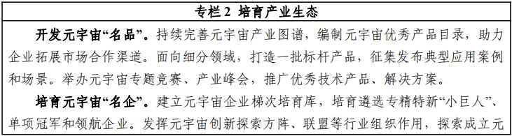 3.构筑协同发展产业生态。着力培育元宇宙龙头企业和专精特新中小企业,打造产业创新联合体,构建大中小企业 融通发展、产业链上下游协同创新的生态体系。鼓励地方结 合产业基础,建设一批元宇宙创新应用先导区、科技园区、 产业园,构建特色化的元宇宙产业集群。支持建立元宇宙开 源社区,鼓励用户积极参与元宇宙技术创新和内容生产,建立健全数字内容流通新机制、新模式、新业态。