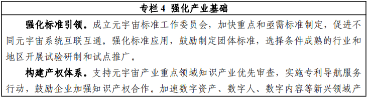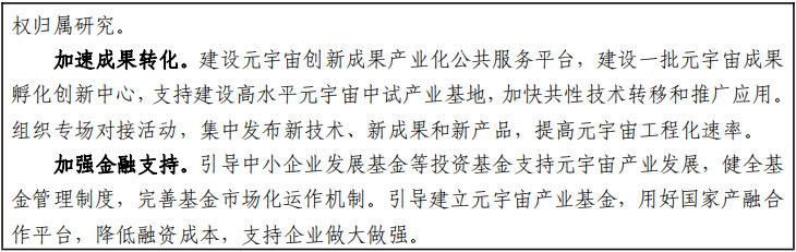 11.提升创新支撑能力。支持建设元宇宙重点实验室、制造业创新中心、 内容制作基地等载体,加强基础技术研究, 加快共性技术突破。打造元宇宙中试平台,强化新技术产品 测试验证能力,加速优秀成果产业化落地。构建元宇宙产品 评估评测体系,提升元宇宙产品和服务质量。健全元宇宙知 识产权保护体系,提供高质量、专业化知识产权服务。 引导 金融资本支持元宇宙发展,推动减税降费政策向元宇宙相关产业倾斜,营造健康可持续的产融合作环境。