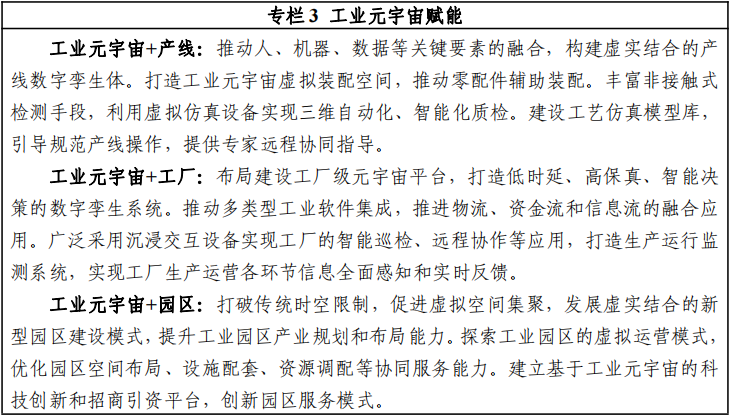 4.探索推动工业关键流程的元宇宙化改造。建设工业元宇宙基础通用模型数据库,打造高精度、可交互的工业虚拟 映射空间。建设工业元宇宙仿真设计与验证平台,布局生产 环节应用,提升设计阶段有效性和生产阶段效率。探索基于 元宇宙的产线运维、产品检测新模式,强化预测性维护,提 高运维检测效率和服务质量。打造基于工业元宇宙的营销平台和虚拟培训系统,提供沉浸式销售和培训环境。