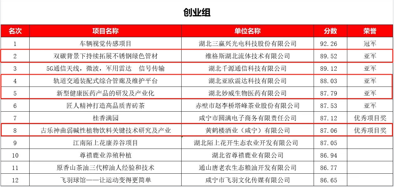 比赛现场,来自全市的24个创业组项目和5个创新组项目参加了路演答辩。经过竞赛角逐,咸宁高新区维格斯湖北流体技术有限公司《双碳背景下持续拓展不锈钢绿色管材》项目、湖北亚欧震达科技有限公司《轨道交通装配式综合管廊及维护平台》项目和湖北妙威生物医药有限公司《新型健康医药产品的研发及生产化》项目成功晋级省级复赛,黄鹤楼酒业(咸宁)有限公司《古乐神曲弱碱性植物饮料关键技术研究及产业》项目荣获创业组优秀项目奖。