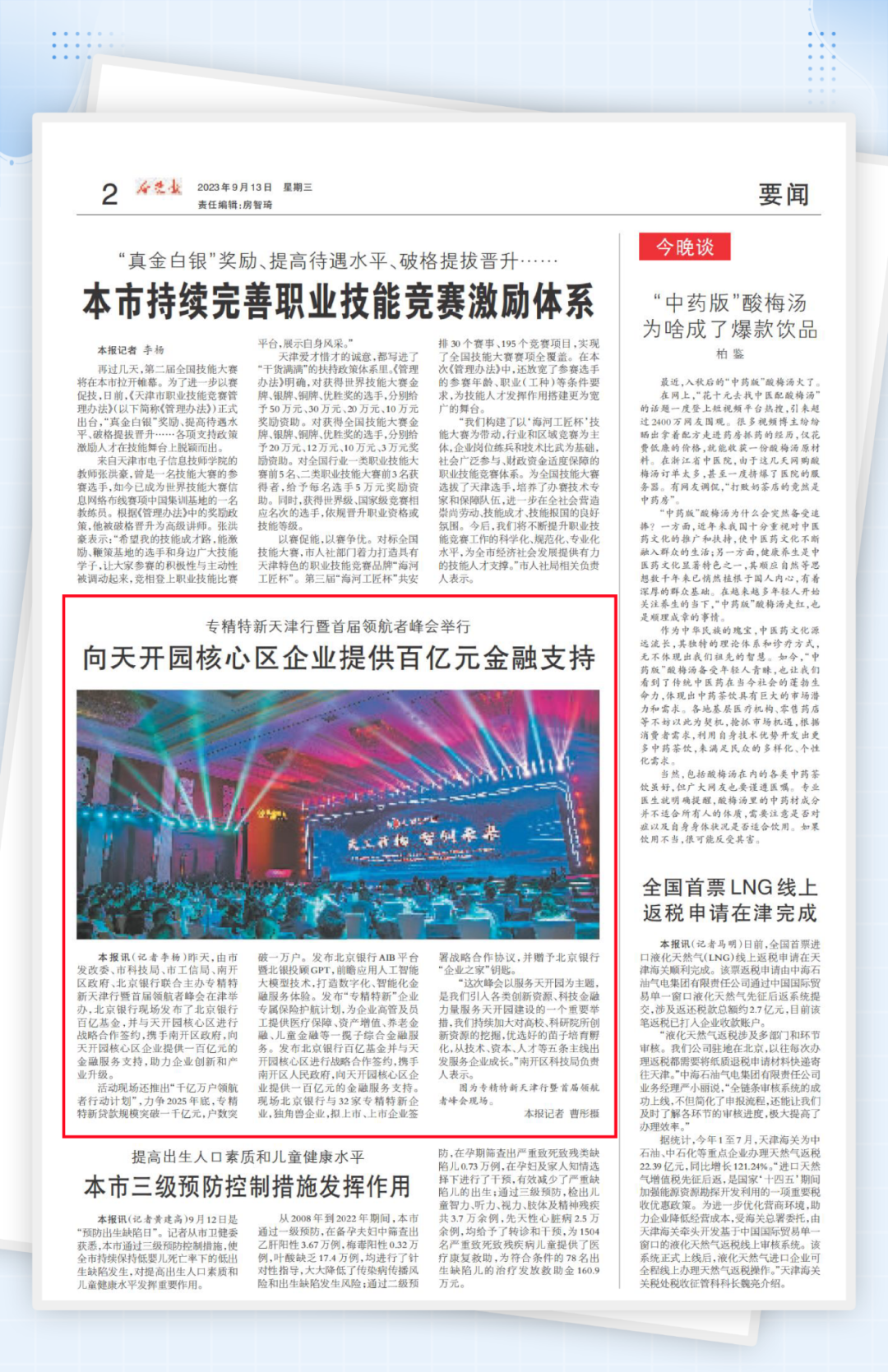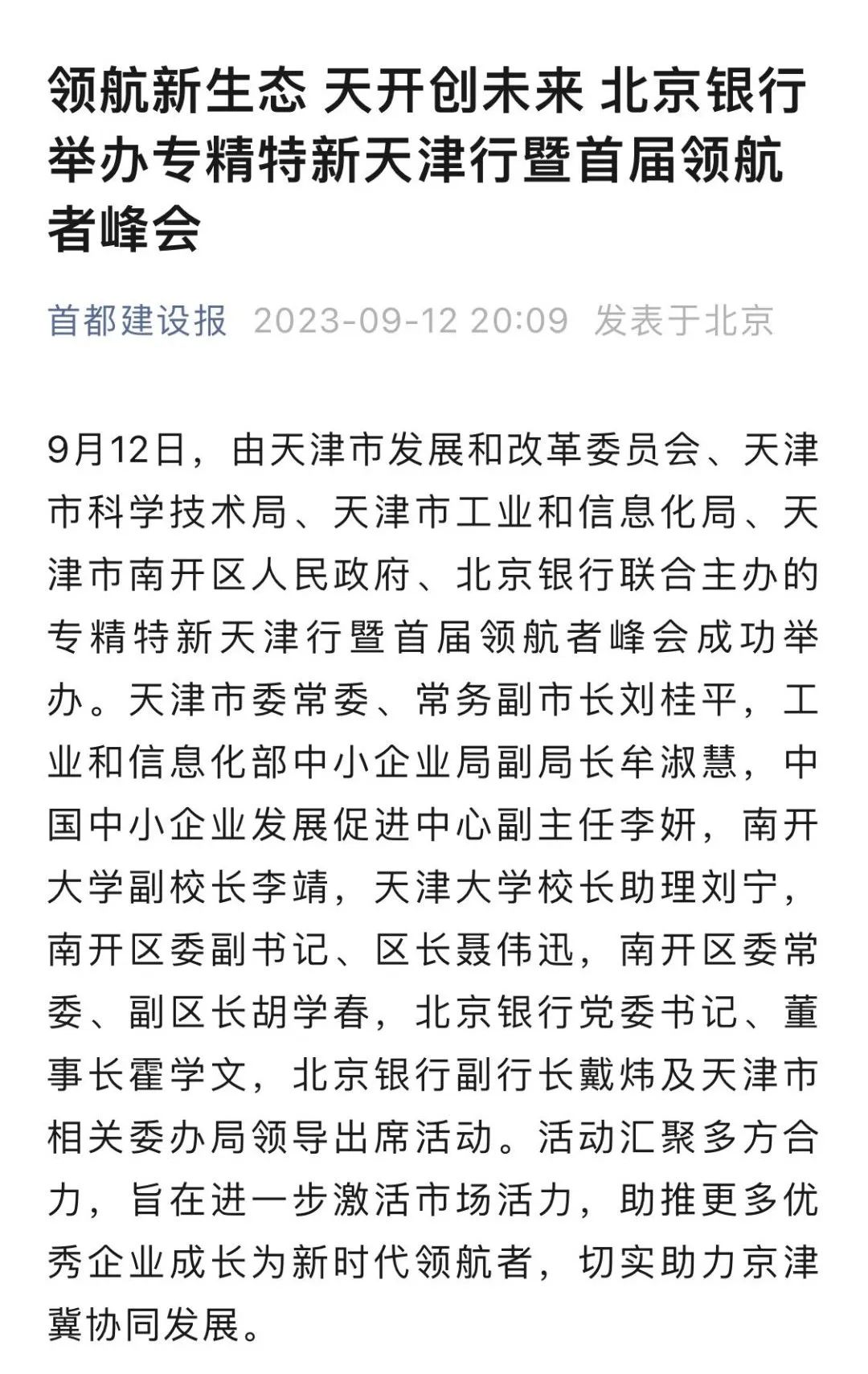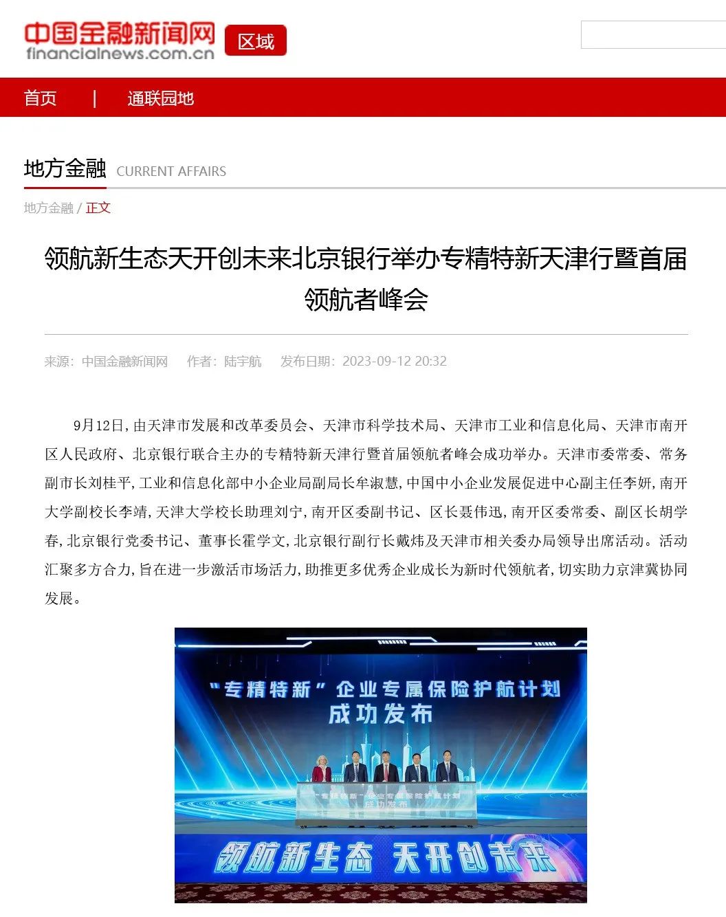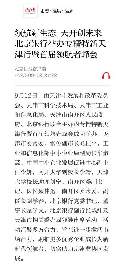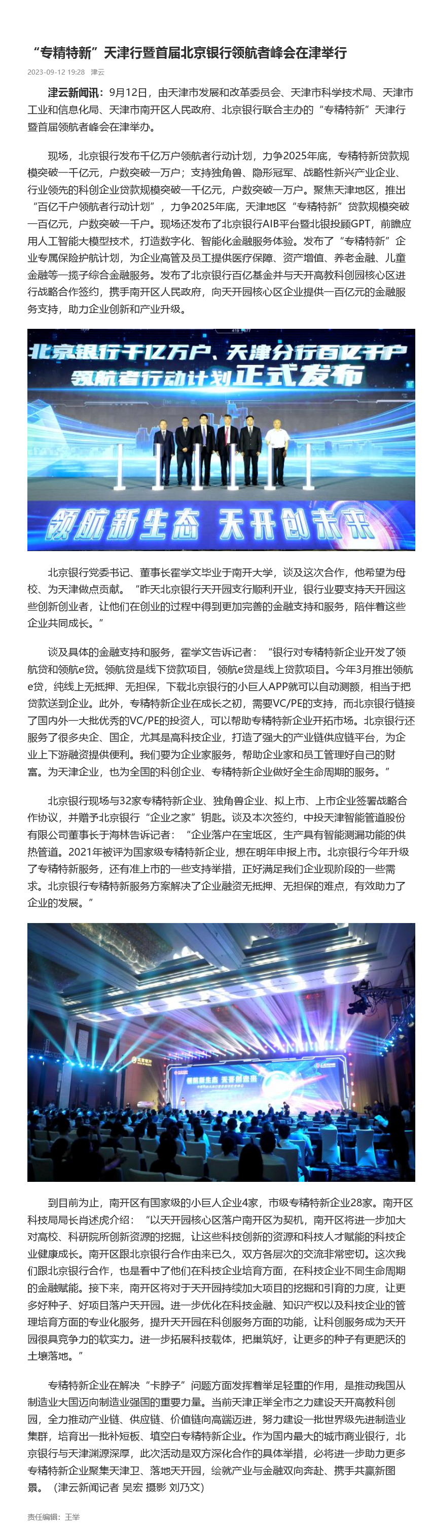 日前,由市发展改革委、市科技局、市工业和信息化局、南开区政府、北京银行联合主办的“专精特新”天津行暨首届领航者峰会在津举办,北京银行现场发布了北京银行百亿基金,并与天开园核心区进行战略合作签约,携手南开区政府,向天开园核心区企业提供100亿元的金融服务支持,助力企业创新和产业升级。天津日报、天津广播电视台、今晚报、津云等媒体对此进行了报道。
