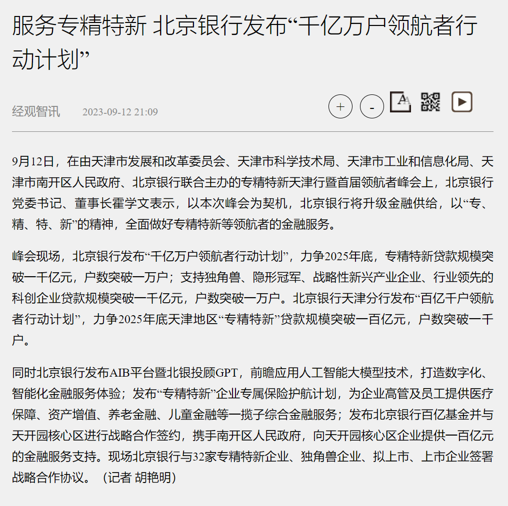 活动现场还推出“千亿万户领航者行动计划”,力争2025年底,专精特新贷款规模突破一千亿元,户数突破一万户。发布北京银行AIB平台暨北银投顾GPT,前瞻应用人工智能大模型技术,打造数字化、智能化金融服务体验。发布“专精特新”企业专属保险护航计划,为企业高管及员工提供医疗保障、资产增值、养老金融、儿童金融等一揽子综合金融服务。发布北京银行百亿基金并与天开园核心区进行战略合作签约,携手南开区人民政府,向天开园核心区企业提供一百亿元的金融服务支持。现场北京银行与32家专精特新企业,独角兽企业,拟上市、上市企业签署战略合作协议,并赠予北京银行“企业之家”钥匙。