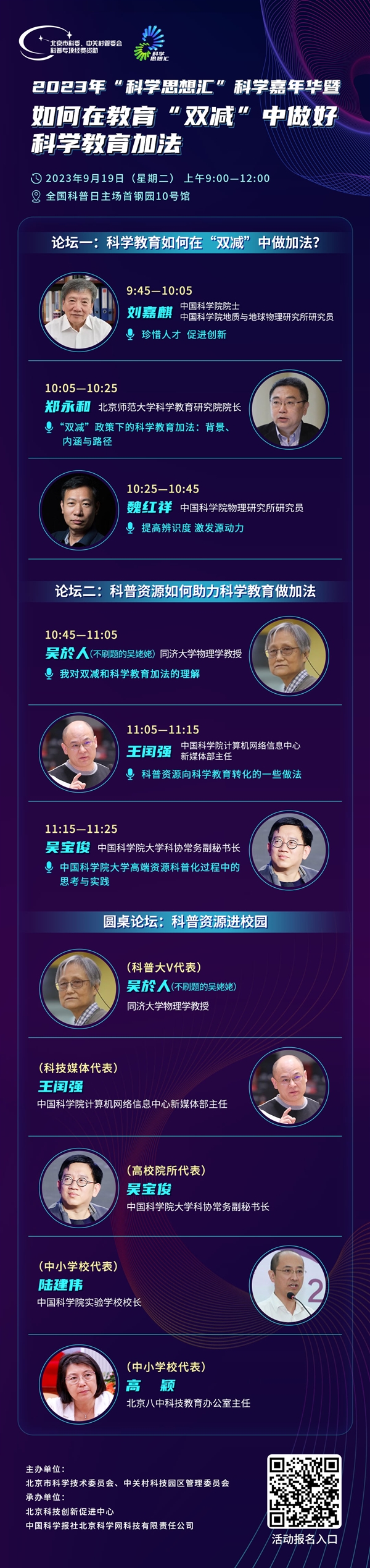 在科技飞速发展的时代,如何为青少年提供更优质的科学教育,培养具备科学家潜质、愿意献身科学研究事业的青少年群体?如何适应科技发展和产业变革的需要,整合校内外资源,推进学校主阵地与社会大课堂的有机衔接?2023年9月19日,让我们共同探讨科学教育的加法,为科普事业发展献计献策。