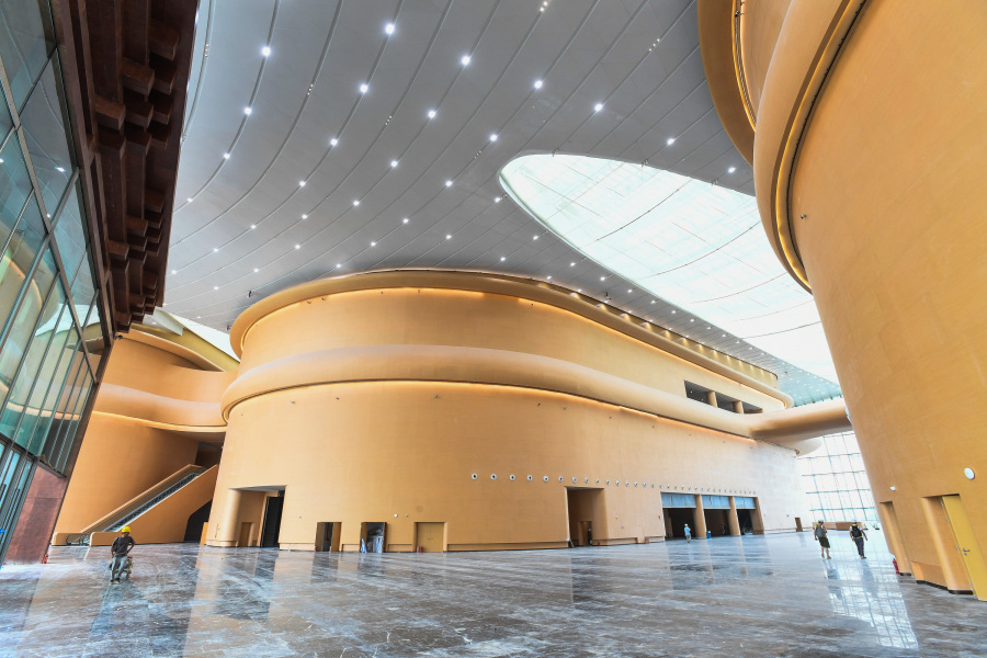 IFF永久会址的中国气派突出,飞檐反宇、翼角起翘、斗拱铺作等一系列“国风元素”蕴藏其中。广州南沙明珠湾管理局相关负责人介绍道,IFF永久会址屋面造型由四瓣金属大屋盖穿插三瓣玻璃采光顶,“波折起伏”富有节奏动感,生动捕捉了木棉花开的动态美,远看就如同迎风绽放的木棉花。而国际会议中心内部的“船厅”则充分适应岭南地区气候特征,与中庭天窗形成对流,自然通风,同时向景观面开敞,将建筑空间引入山水之中,展现因地制宜的建筑风貌。