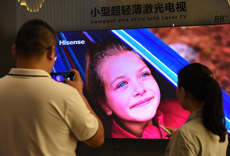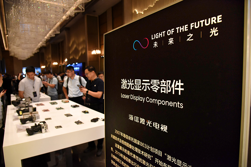 参会者在激光显示技术成果展示区观看一款超轻薄激光电视。