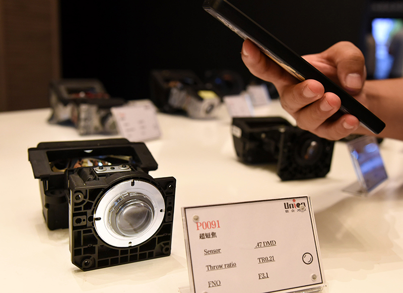 一名参会者在拍摄激光电视使用的超短焦镜头。