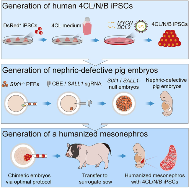 南方+记者从中国科学院广州生物医药与健康研究院了解到,在研究中,研究人员利用具有高分化潜能、强竞争及抗凋亡能力的新型人诱导多能干细胞,结合优化的胚胎补偿技术体系,在肾脏缺陷猪模型体内实现了人源化中肾的异种体内再生。