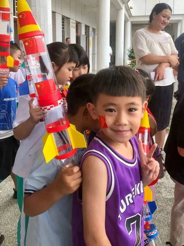随后,大家纷纷将自己的作品搬到教室外的空地上。“3、2、1,点火……”随着一声口令,“火箭”腾空而起喷出长长的水柱,在空中画出一道弧线,同学们用自己的劳动实现了“航天梦”,此刻,小小的航天梦想也随之“起飞”。
