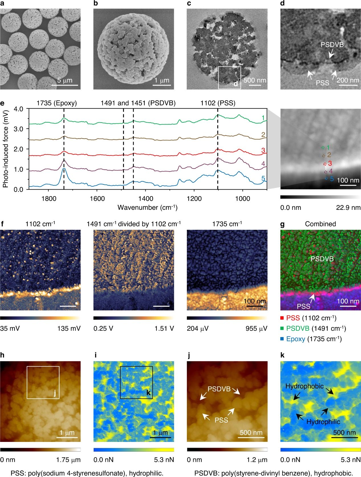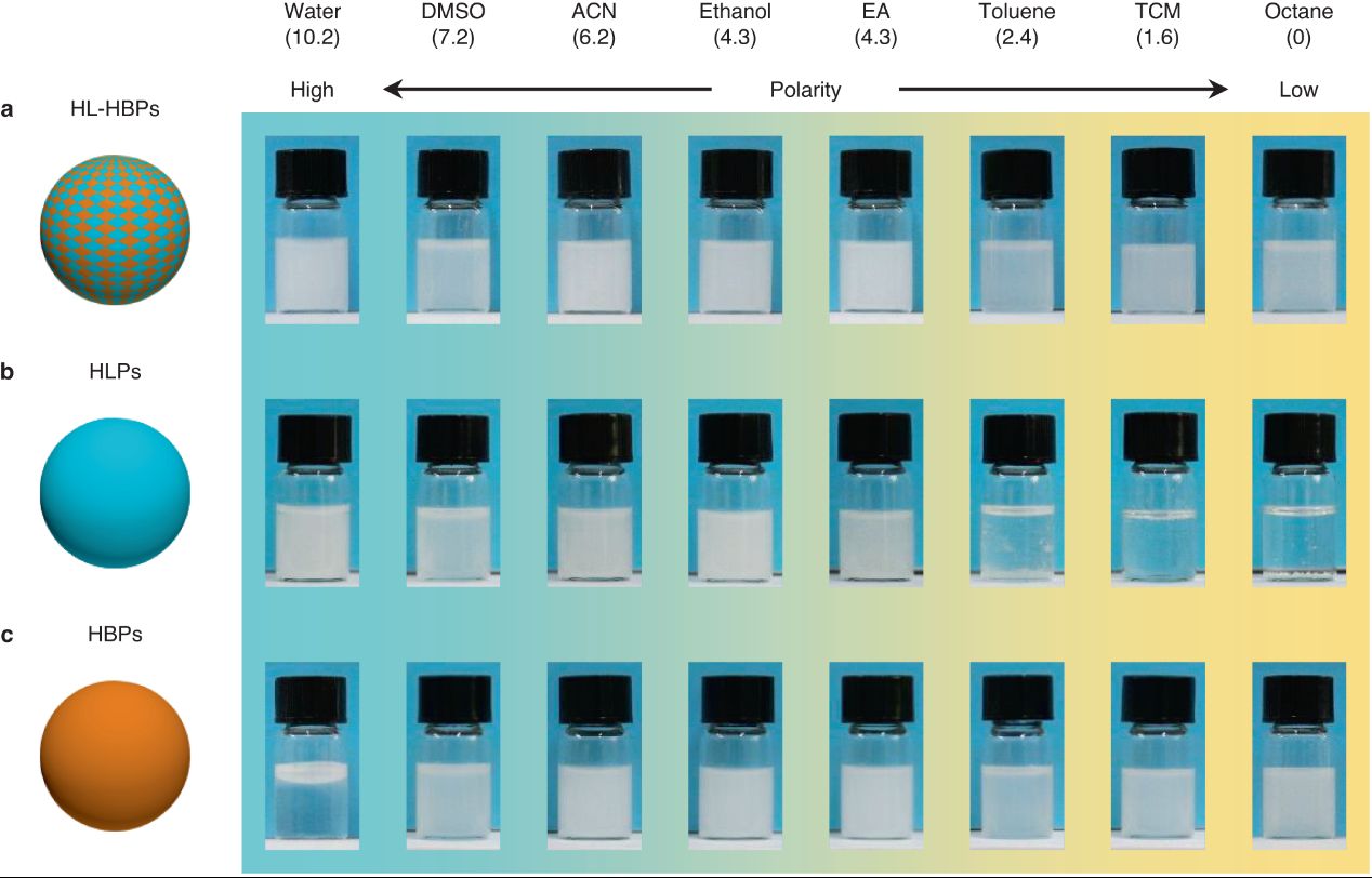 图1. 亲水-疏水异质微球的表征。该团队利用前期发展的乳液界面聚合合成方法,合成了亲水-疏水异质微球,