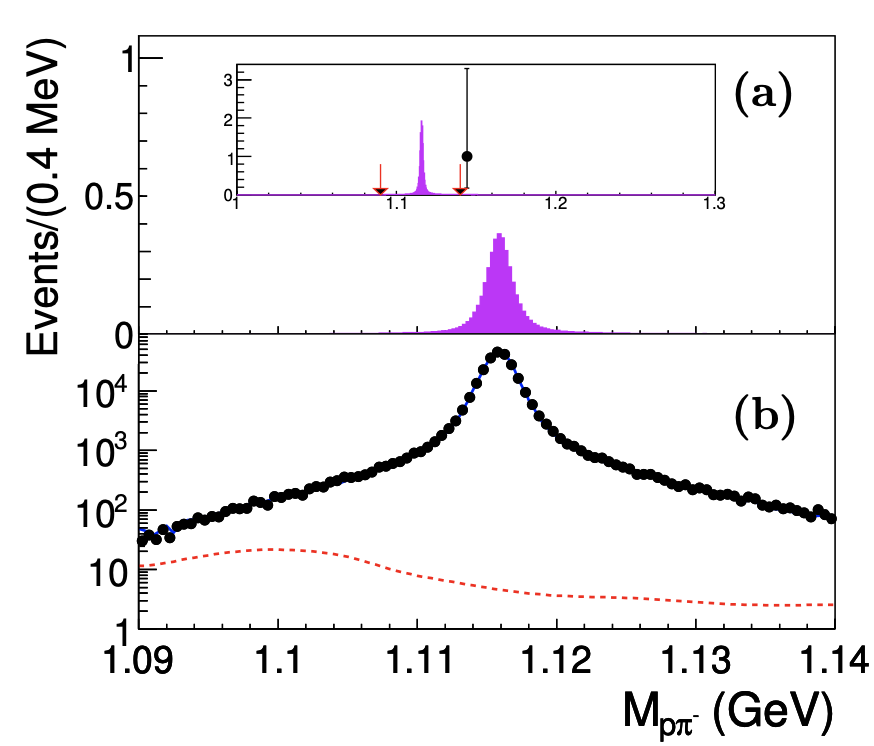 图:错误符号(a)和正确符号(b)的分布图,实验数据表示为黑色数据点,蒙特卡洛模拟的振荡信号用粉色实心直方图表示,本底则用红色的虚线表示。