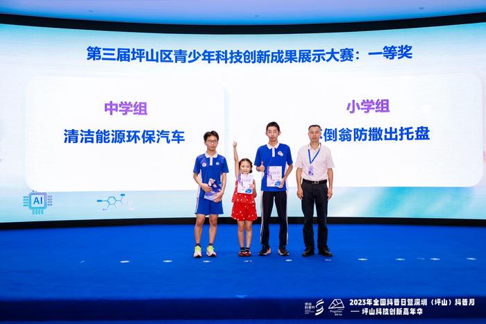 作为本次嘉年华重要组成部分,第三届坪山区青少年科技创新成果展示大赛精彩上演,经过3个月的征集、层层选拔,24个优秀项目入围决赛。在现场,“小创客”创意不断,流浪动物投喂机、坐姿纠正仪、智慧育苗机……一个个奇思妙想,让评委专家直呼“惊喜”和“有创意”,鼓励青少年保持对科学技术的兴趣,树立远大理想。来自坪山区中心小学的《不倒翁防撒出托盘》项目获得小学组一等奖,来自坪山实验学校的《清洁能源环保汽车》项目获得中学组一等奖。