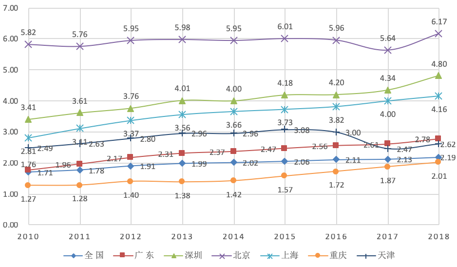 图2 2010—2018年我国主要城市R&D投入强度比较