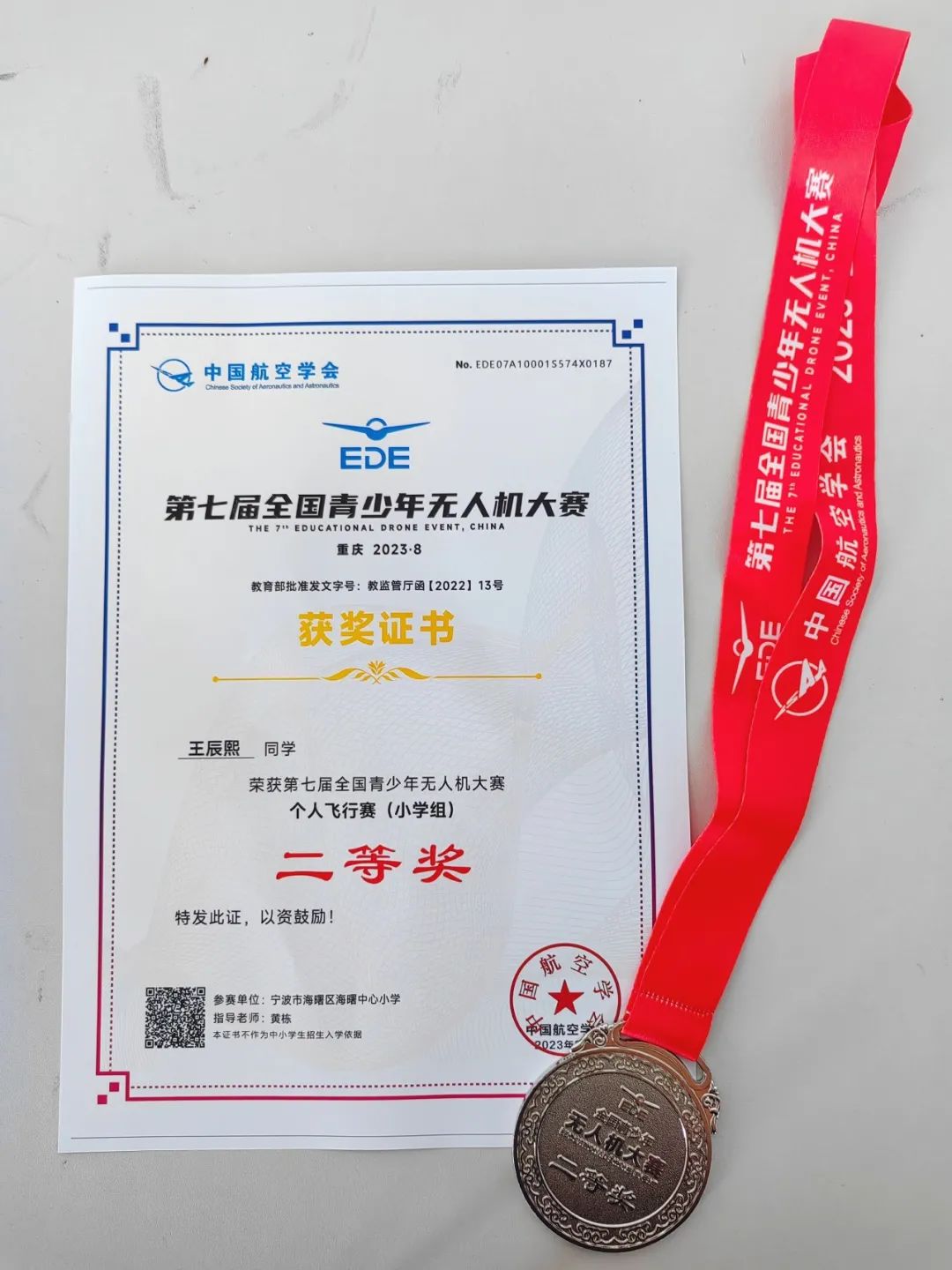 2022年海曙中心小学组建无人机校队,吸引了3-5年级一批小小飞行爱好者,经过认真训练,王辰熙和兰添同学在第七届全国无人机大赛(浙江赛区)比赛中分别获得一等奖和二等奖。王辰熙同学还代表浙江队参加了在重庆举行的由中国航空学会主办的全国青少年无人机大赛,获得二等奖。