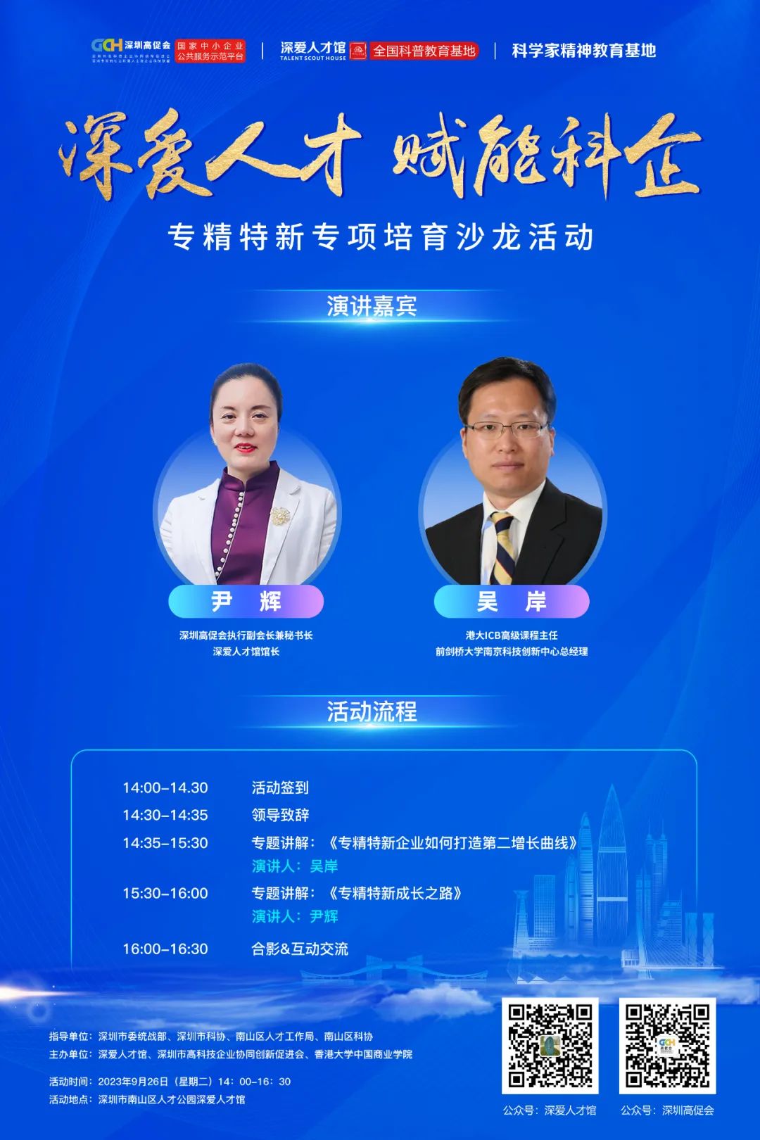 现拟于9月26日,在深圳人才公园深爱人才馆,举办”深爱人才 赋能科企”专精特新专项培育沙龙活动,欢迎广大企业报名参与!