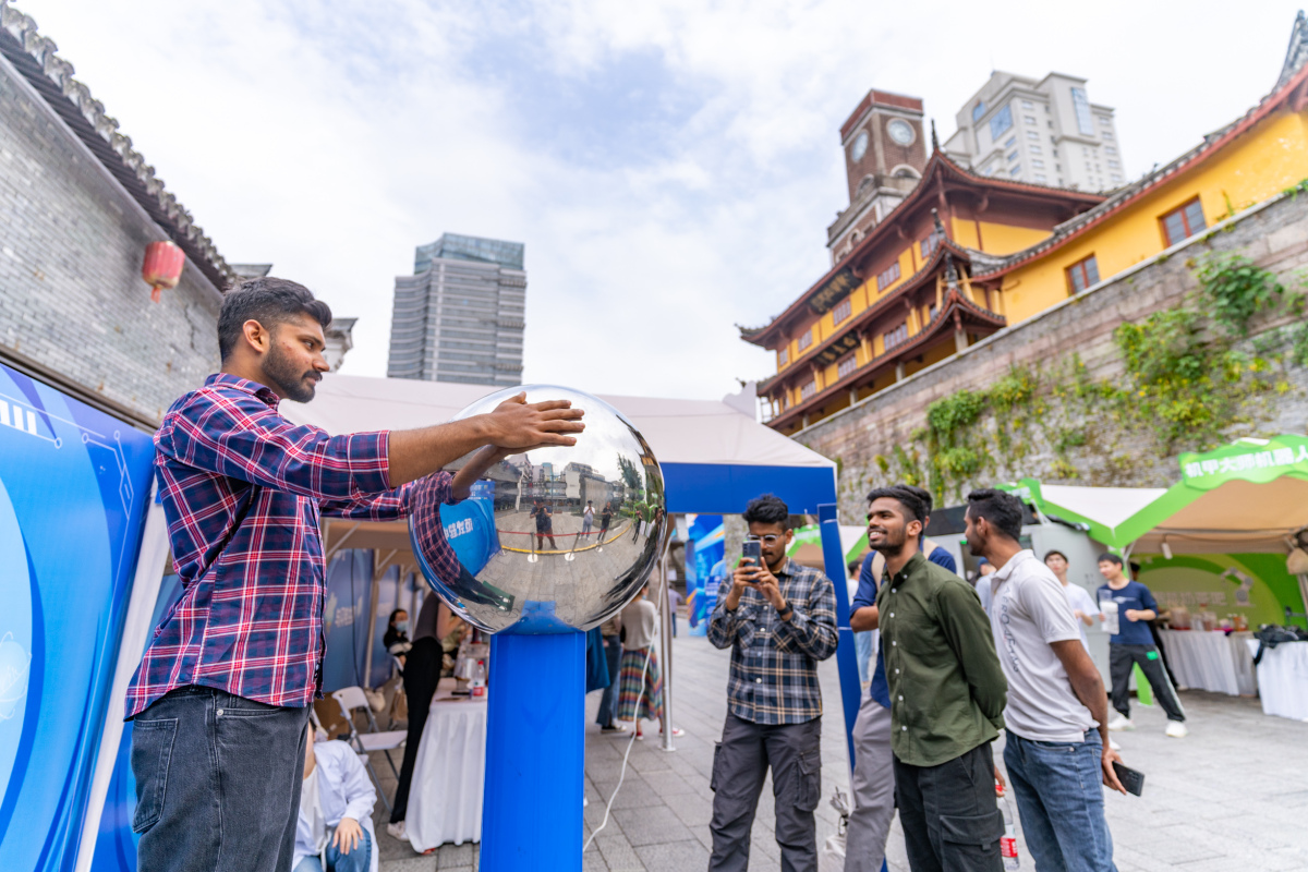 鼓楼沿精彩的科普实验秀不仅吸引了大量青少年,也让不少外国游客驻足体验。