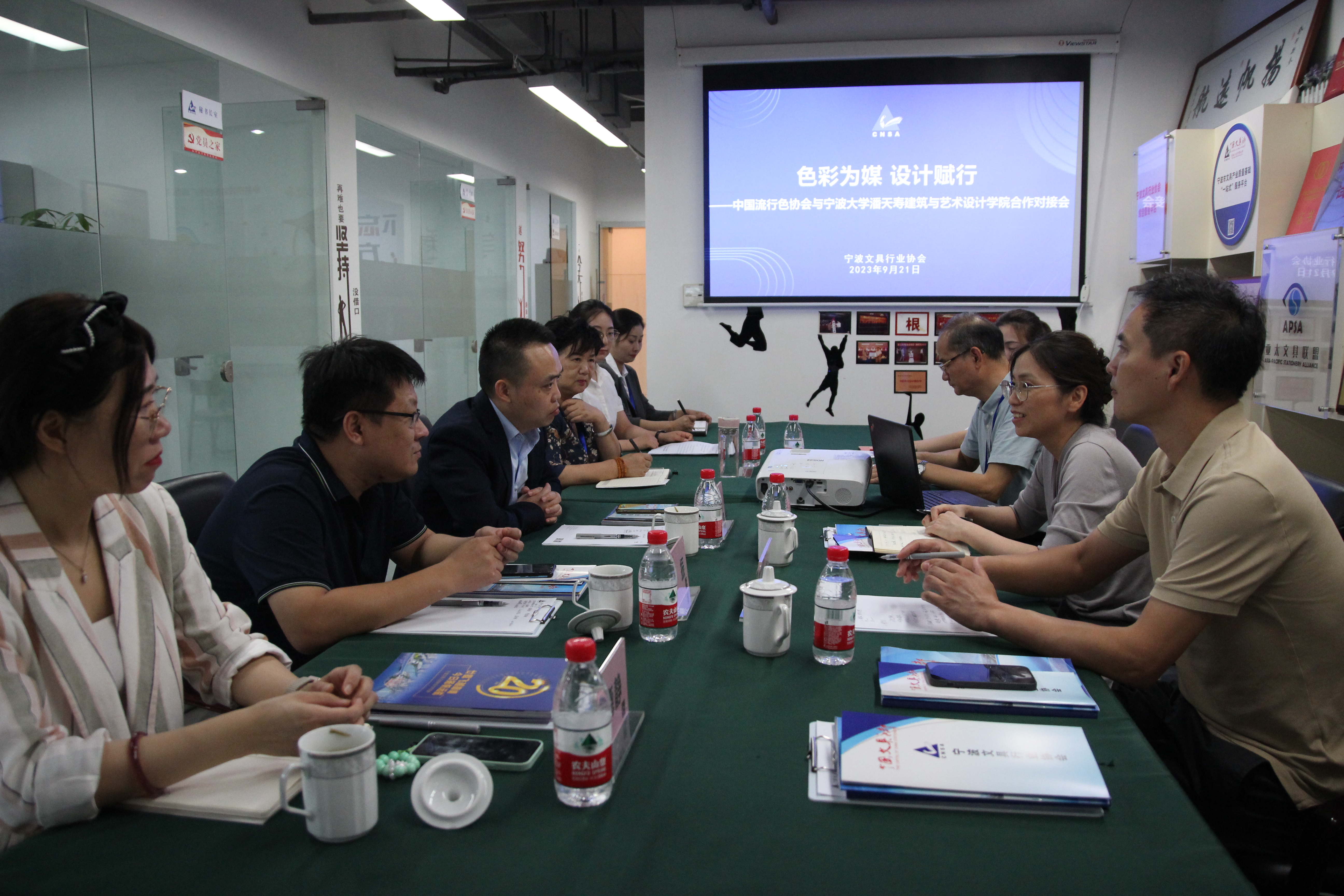 9月21日,为以色彩为媒介,赋能宁波设计人才培育,深化产教融合,宁波文具行业协会作为中国流行色协会宁波服务站搭建产学研合作平台,邀请中国流行色协会贺显伟副会长、王振副秘书长、王晓静培训技术总监一行莅临宁波,与宁波大学潘天寿建筑与艺术设计学院周艳副院长、董荪副教授召开合作对接会,宁波文具行业协会副理事长汪勇、秘书长俞勇锋携秘书处全体参会。