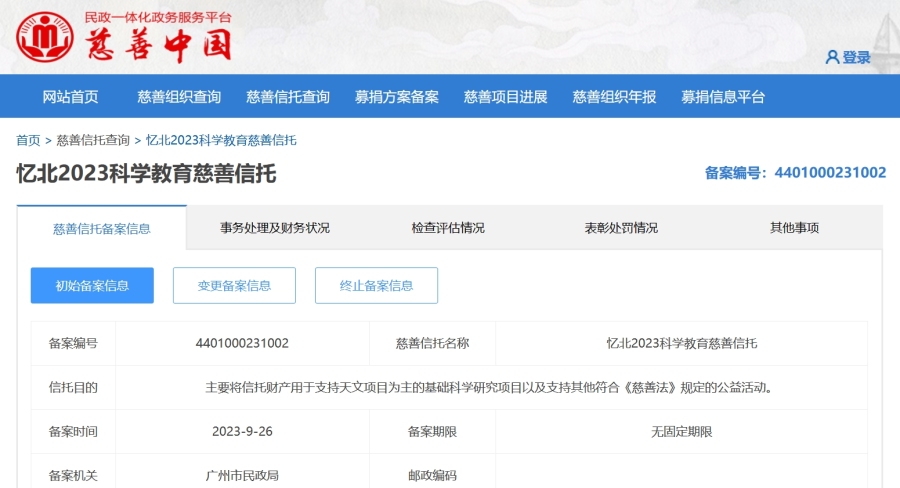汉正家族办公室:慈善信托必须基于慈善目的,这也是慈善信托最基本的特征。忆北慈善信托的相关主体除了委托人、受托人,还有监察人,具有多方监管的优势。同时,该信托在银行开立了慈善信托专户,信托财产与委托人、受托人的固有财产相互独立,即慈善信托设立后,信托财产就与委托人的自有财产相分离,成为独立运作的财产,仅服务于信托目的。目前,忆北慈善信托已在慈善中国备案(备案编号:4401000231002),而共同委托方广州市慈善会上线的公开募捐项目忆北天文学项目也进行了公开募捐备案(公开募捐编号:5144010051736101XNA23010)。