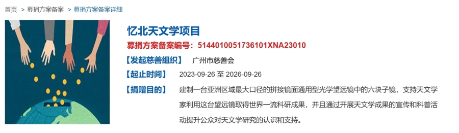 据悉,在多方推动下,舒琦最终选择了出资50万元,联同广州市慈善会作为委托人,委托粤财信托设立忆北慈善信托,监察人是汉正家族办公室,无固定期限,旨在推动天文学领域发展,首个支持项目则是筹资助力EAST望远镜建设。而为了在该信托上汇集社会力量,共同委托方广州市慈善会同时上线了忆北天文学项目,计划通过公开募捐筹集善款,持续为信托注入活水,用于建造EAST望远镜6块子镜、4次建设台址调研及10场天文科普活动。
