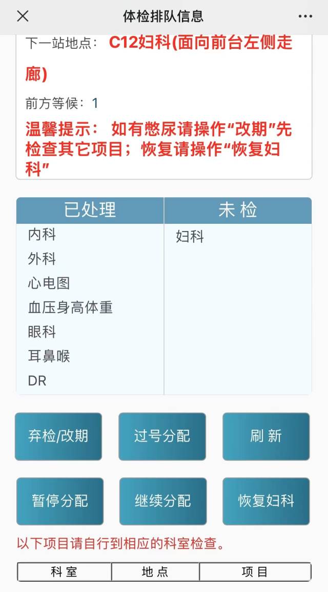 智能导诊过程中,患者也能够对检查项目顺序进行人性化选择。如正在憋尿,智能导诊提示的下一个检查项目却不能憋尿,患者则可以在系统上选择“改期”,系统将会重新分配优先检查项目。待检查完毕,再选择“恢复”,即能继续做上一个本该检查的项目。