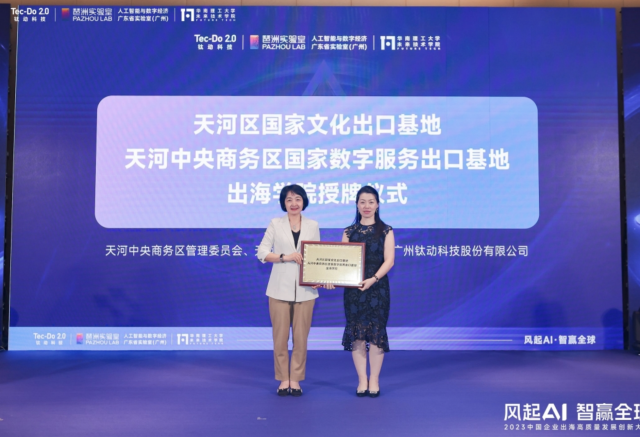笔者从活动获悉,数字服务出海有了专业的交流平台,助力天河加快打造人工智能产业发展新高地。钛动科技出海学院获授“天河区国家文化出口基地、天河中央商务区国家数字服务基地出海学院”。