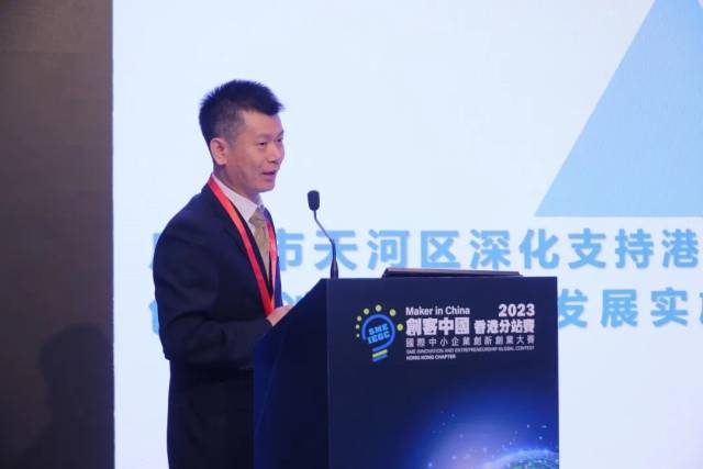 大赛活动上,天河区科工信局以“汇天河,筑未来”为主题开展了创新创业合作推介。会上围绕“营商环境优渥、产业发展优势、创新动能强劲”向穗港两地企业介绍天河,重点推介了今年8月底出台的《广州市天河区深化支持港澳青年创新创业高质量发展实施办法》,该办法由港澳青年参与制定,从“政策对象、载体建设、企业培养、离岸孵化、交流融合、专项支持”六个层面解读政策。