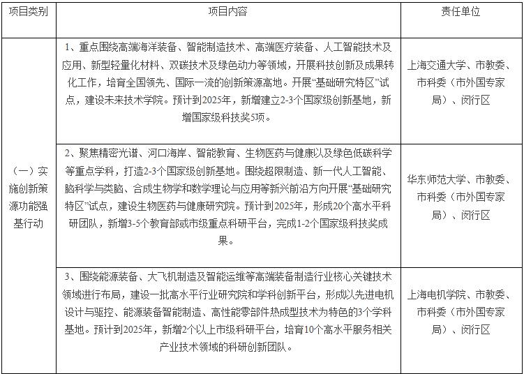 1.提升高校院所创新策源能力。深化相关高校“双一流”建设,实施“基础研究特区”试点。聚焦“大信息、大健康、大能源”等领域,建设若干全国领先、国际一流的优势学科;聚焦人工智能、绿色低碳科学等重点学科以及高端装备、新型材料等重点技术领域,打造若干国家级科技创新基地(平台)。