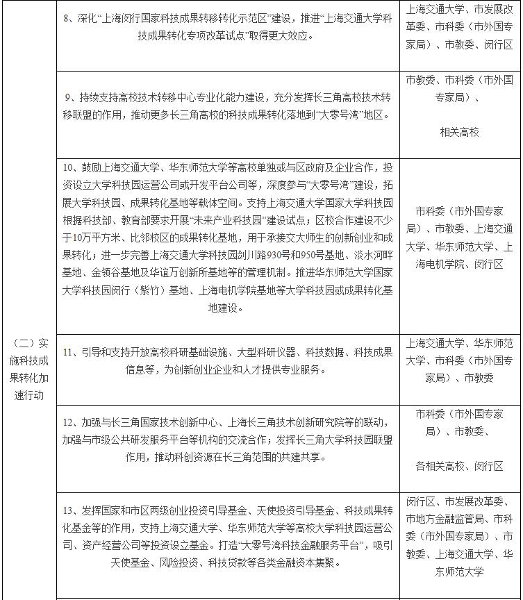 1.深化科技成果转化体系建设。围绕国家有关科技成果转化试点工作,落实职务科技成果权属改革、国际化成果转移转化、市场化技术转移机构培育等任务。持续推进高校技术转移机构专业化建设,充分发挥长三角高校技术转移联盟作用,引导和鼓励长三角高校成果转化落地。
